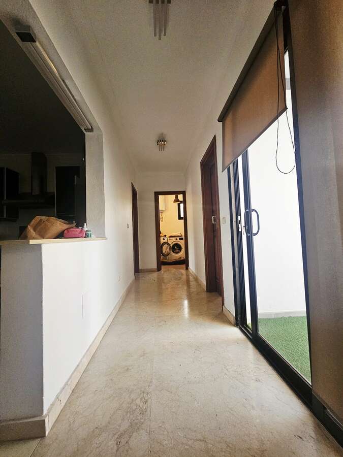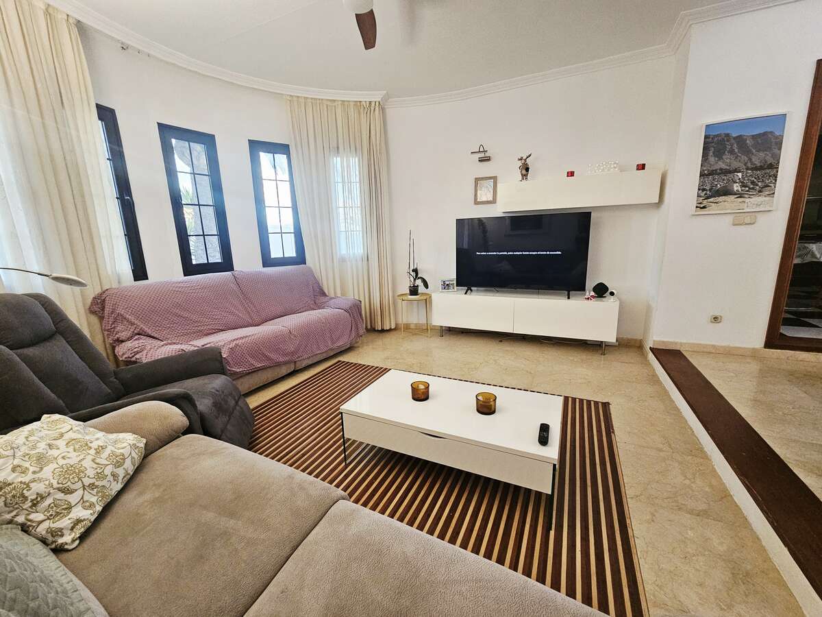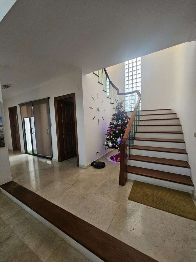 Ample storage space, a dressing room, air conditioning, kitchenware, and bedding are provided. The villa is ready to move into, fully furnished for daily living. Large windows and spacious hallways create a bright and airy feel. A majestic spiral staircase connects the ground floor to the bedroom area. The villa is in excellent condition.