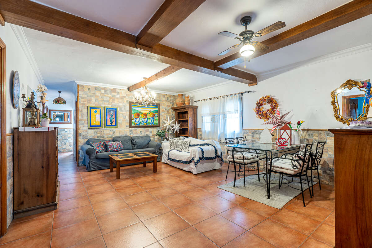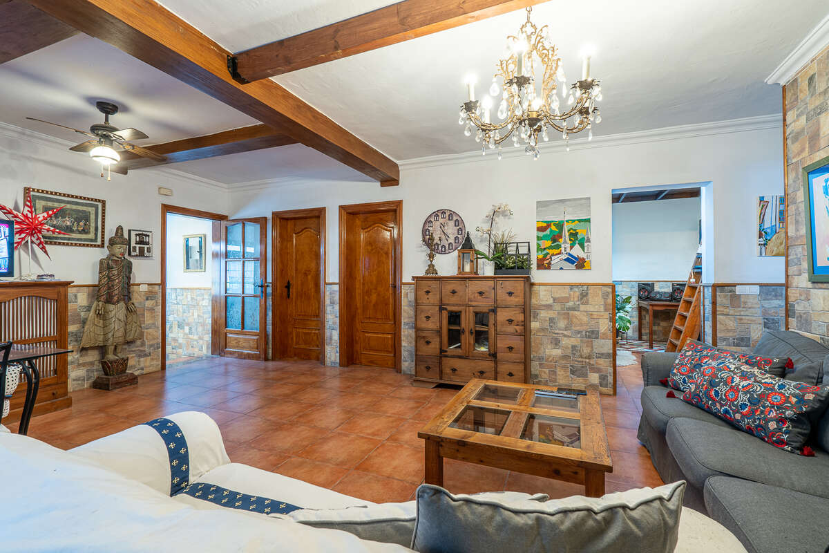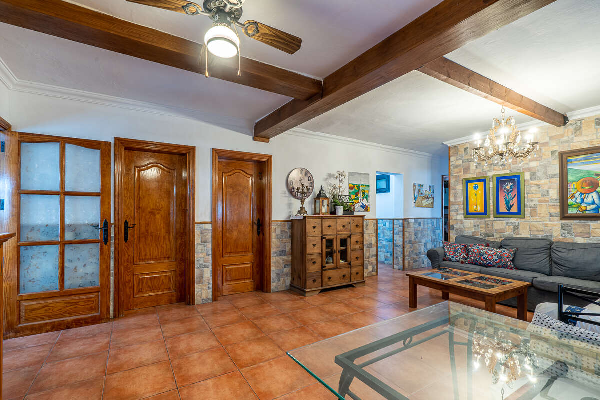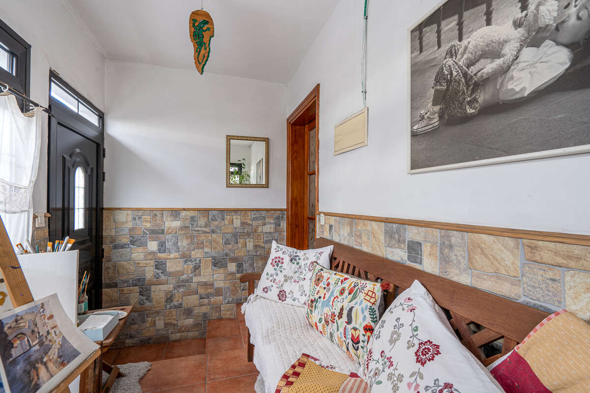 El acceso principal, dispone de un amplio recibidor, actualmente utilizado como espacio artístico y creativo, que da paso a un salón de generosas dimensiones con zona de comedor, muy bien diferenciado y funcional.