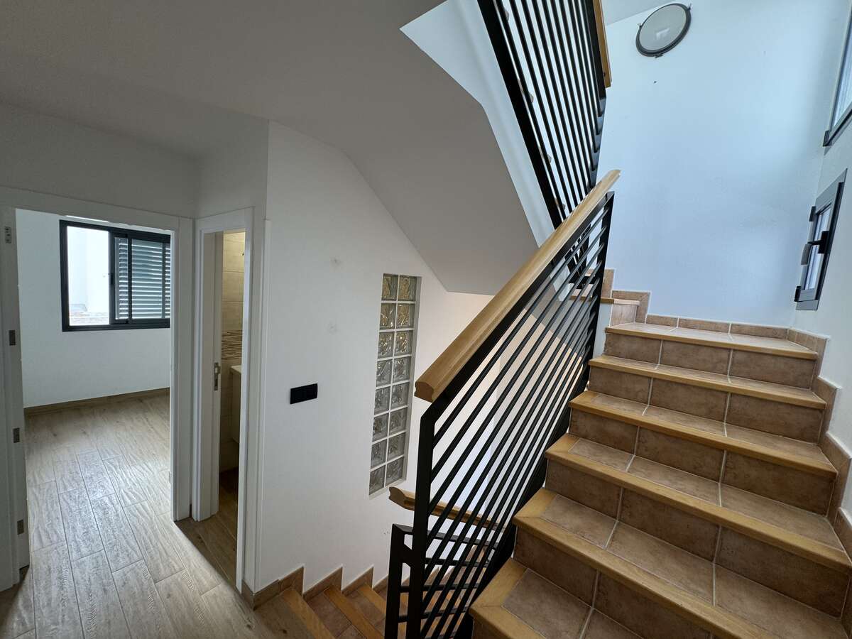 A staircase similar to the one on the first floor leads to the third floor, where a glass door opens onto a spacious private rooftop terrace. This space is one of the defining features of the property: open views of the sea, the mountains, and the surrounding Costa Teguise area.