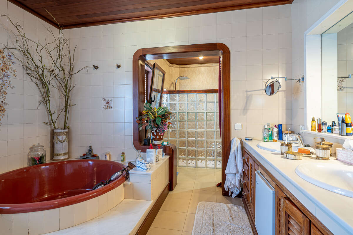 In the sleeping wing, the villa offers three spacious bedrooms; among them, the master suite stands out, a haven of serenity with a private bathroom and dressing room. Furthermore, a staircase leads to a mezzanine. This space is ideal for a private office, a library, or an additional bedroom, offering privileged views and an atmosphere of absolute seclusion.