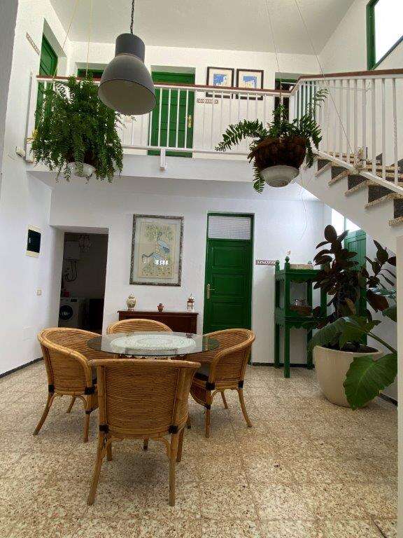 In the village of Haría, you'll find this impressive two-story house with 297m2 of living space, situated on a 1,080m2 plot. The ground floor comprises an entrance hall, central courtyard, four bathrooms, three bedrooms, a separate kitchen, an interior patio, a terrace, a laundry area, and a garage. It also includes several outbuildings such as a wine cellar, a chicken coop, a stable, and a barn—perfect for nature lovers. The upper floor offers three more bedrooms, a full bathroom, and a spacious terrace with views.