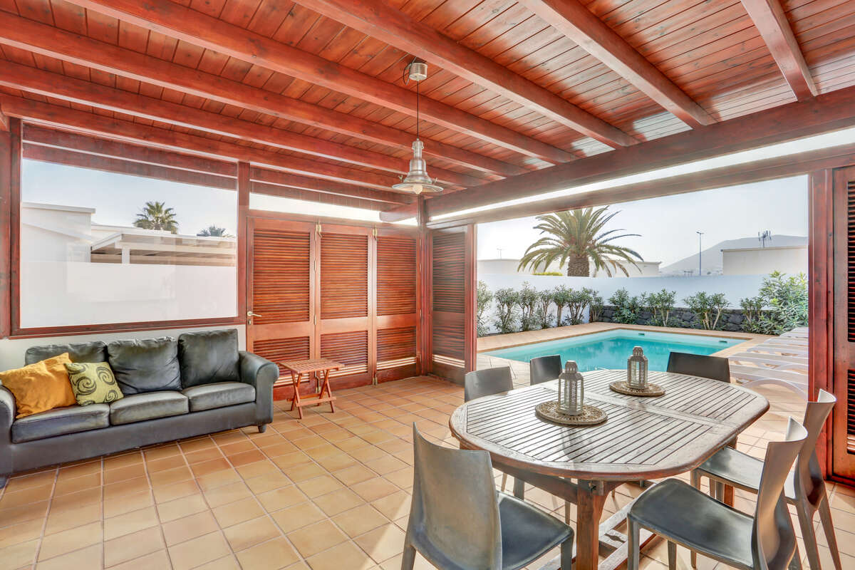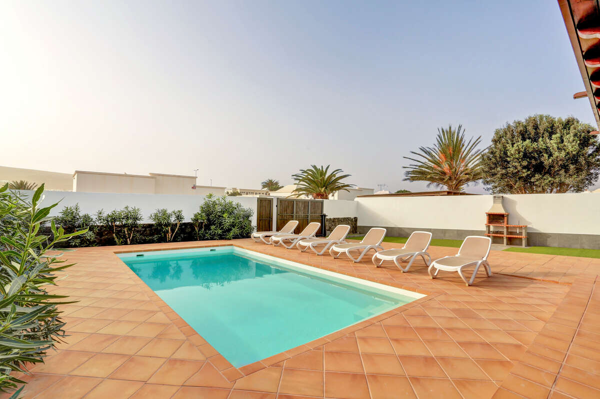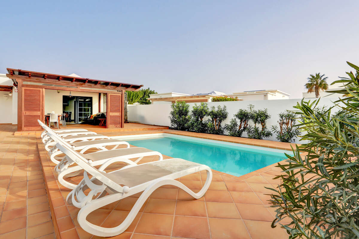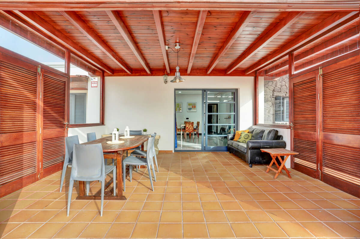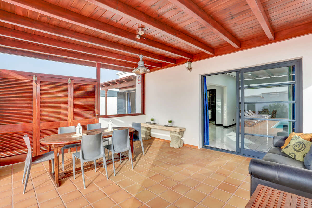 The impressive private heated swimming pool is one of the villa’s main attractions. Its generous size allows you to swim, play, relax and enjoy it all year round thanks to its heating system. It is surrounded by a spacious sun terrace, equipped with sun loungers, outdoor furniture, parasols and even a chill-out area. Its orientation allows for long hours of sunshine, creating an ideal setting both for sun-seekers and for those who prefer to enjoy the mild evenings of southern Lanzarote.