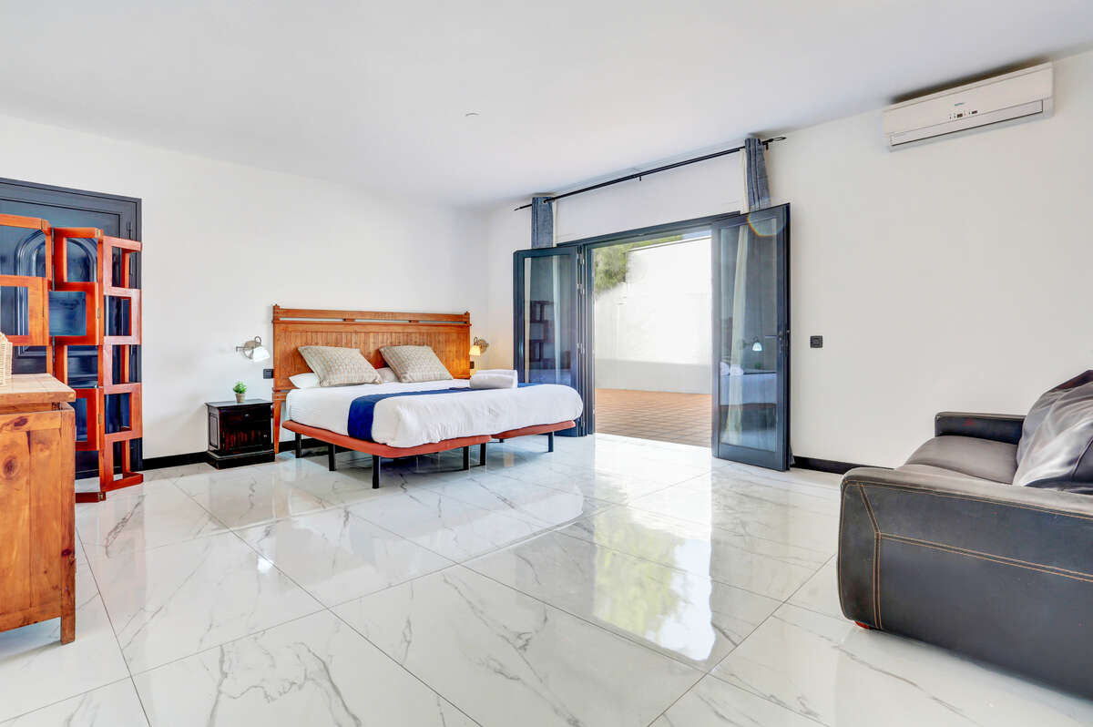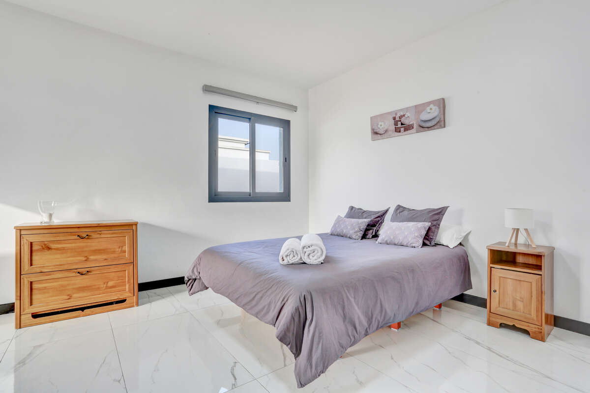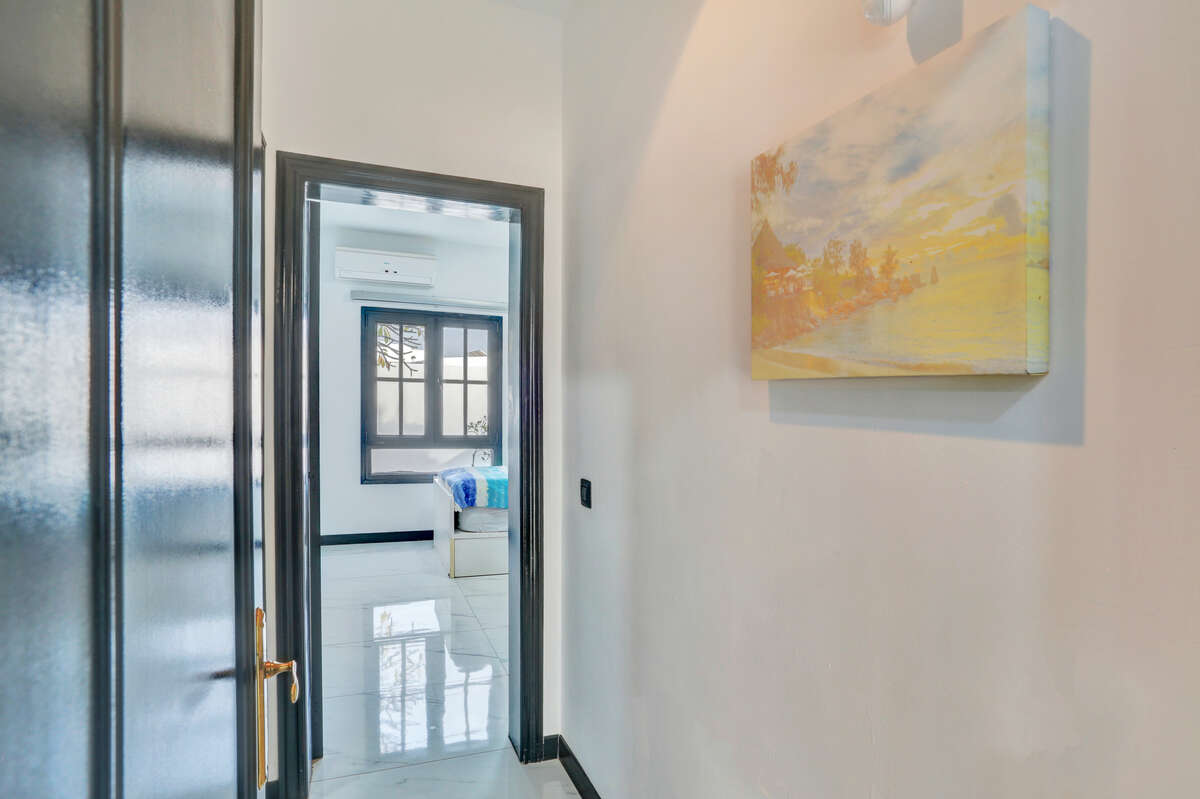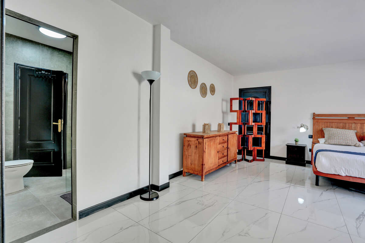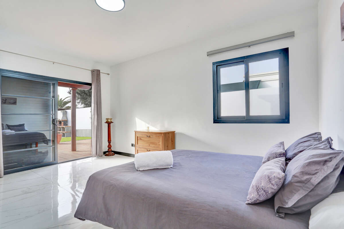 The villa has three bedrooms, two of which are particularly spacious and offer direct access to the outdoor terrace, allowing you to wake up each morning to the warm natural light of Lanzarote and enjoy a private exit onto the veranda or the pool area.