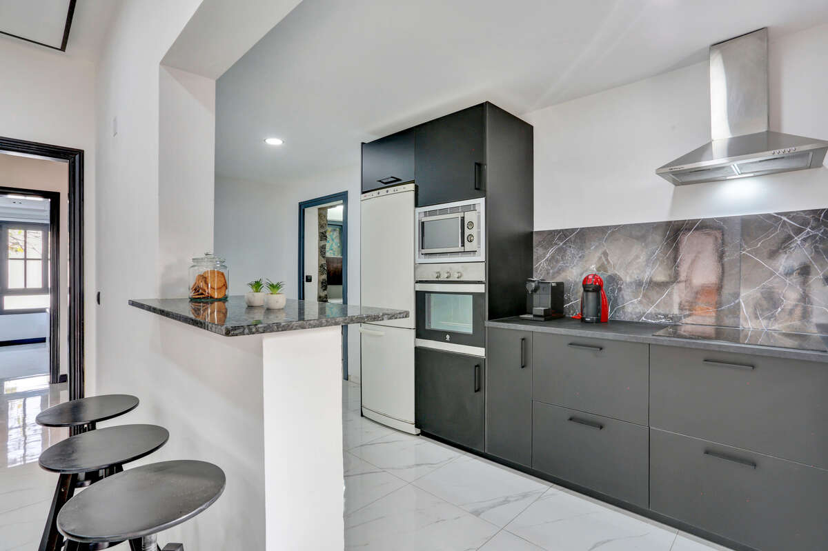The kitchen is a highlight of this villa. It has been completely renovated, featuring new fitted units, modern worktops, energy-efficient lighting and all necessary appliances. Its design meets current standards of practicality and aesthetics, incorporating ample work surfaces, storage cupboards and a contemporary style that combines clean lines and quality materials.