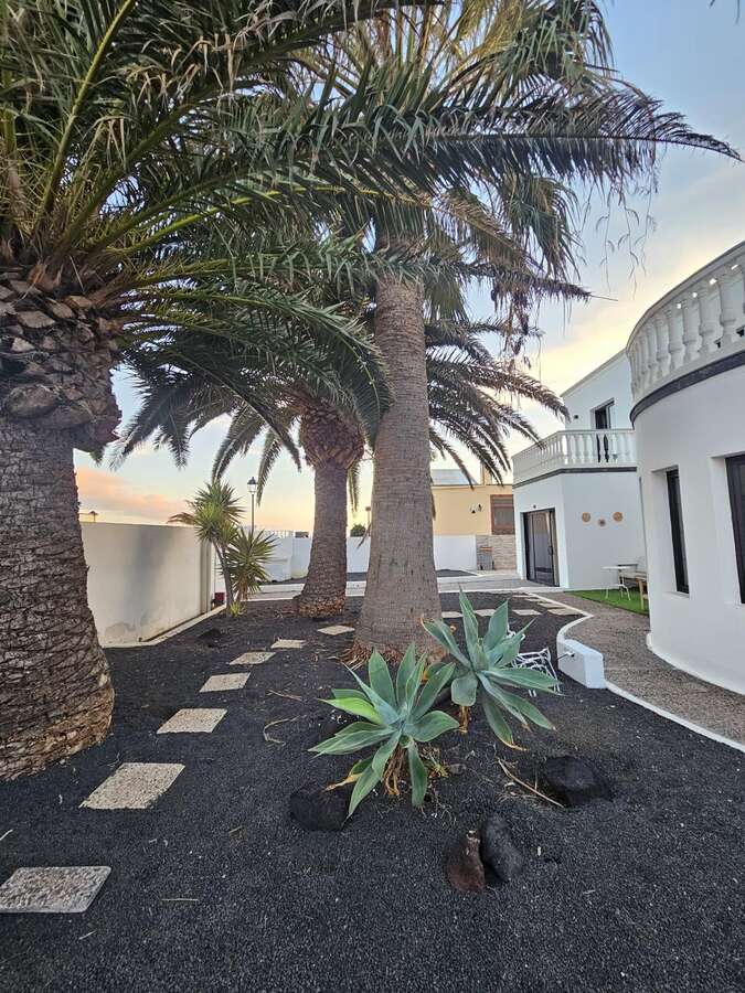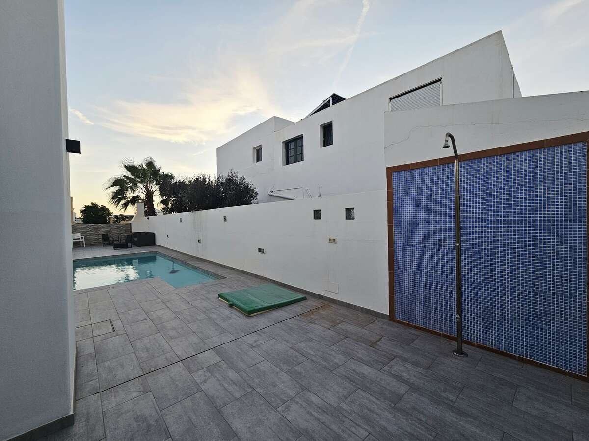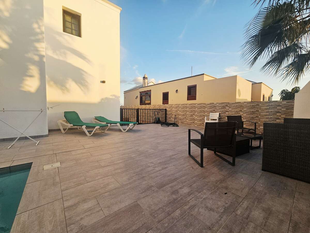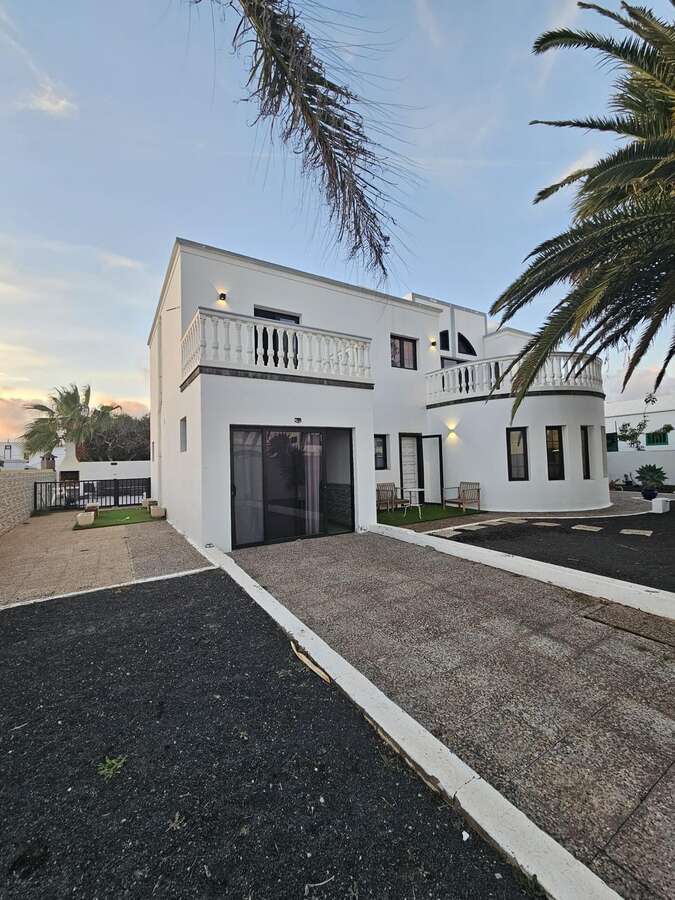 Spectacular detached villa for short-term rental in Tahiche Bajo. This two-story villa features a private pool and a large 500 m² plot. It offers five bedrooms (four doubles and one single), three bathrooms, and a large, fully equipped independent kitchen. The living/dining room and terrace, with views, are accessible from one of the upstairs bedrooms.
