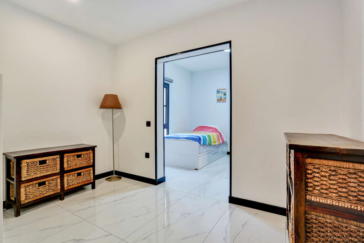 The villa has three bedrooms, two of which are particularly spacious and offer direct access to the outdoor terrace, allowing you to wake up each morning to the warm natural light of Lanzarote and enjoy a private exit onto the veranda or the pool area.