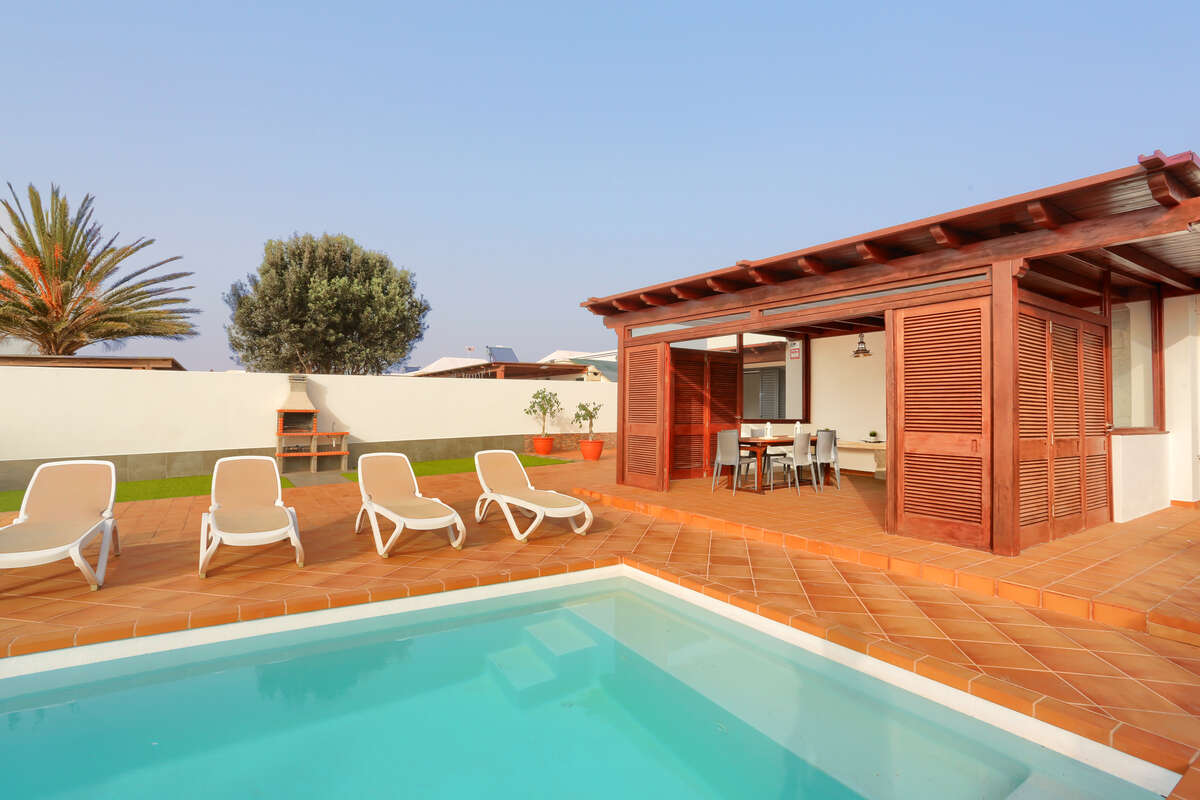 The impressive private heated swimming pool is one of the villa’s main attractions. Its generous size allows you to swim, play, relax and enjoy it all year round thanks to its heating system. It is surrounded by a spacious sun terrace, equipped with sun loungers, outdoor furniture, parasols and even a chill-out area. Its orientation allows for long hours of sunshine, creating an ideal setting both for sun-seekers and for those who prefer to enjoy the mild evenings of southern Lanzarote.
