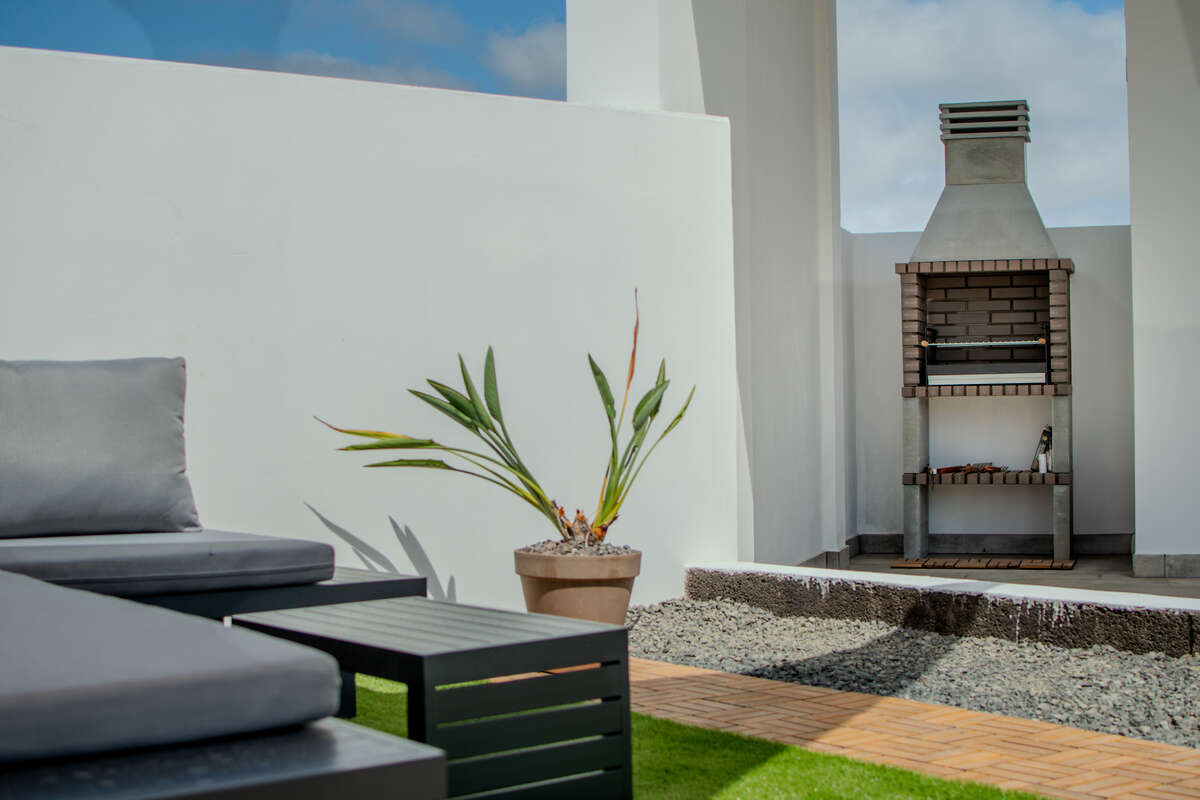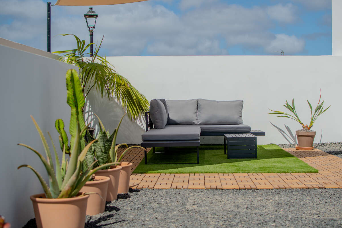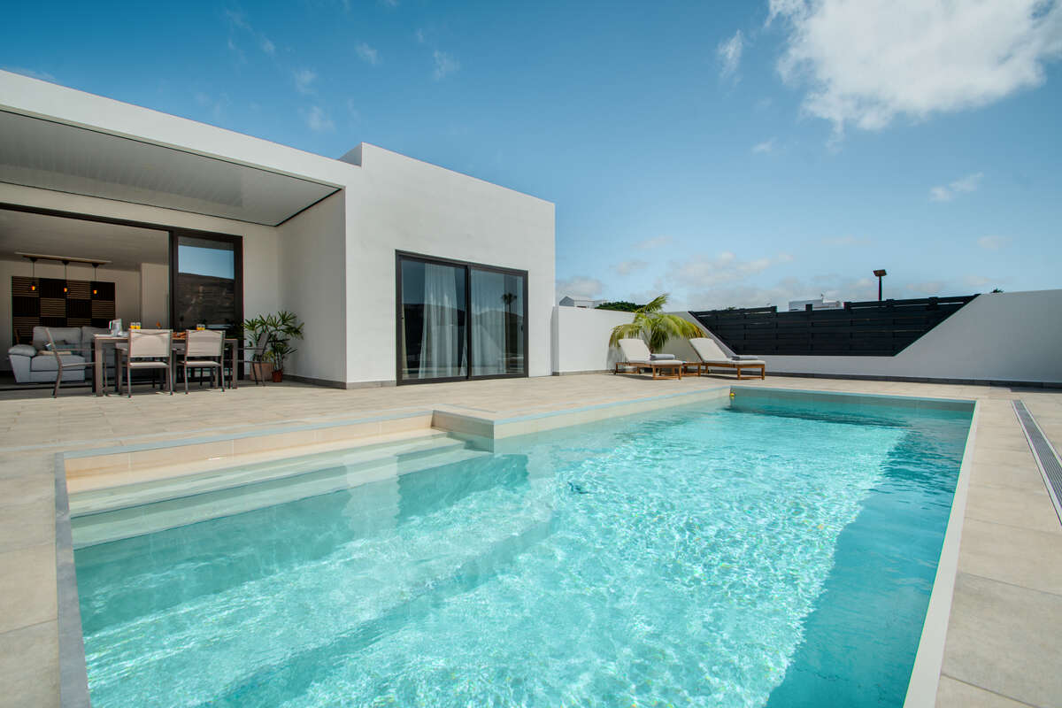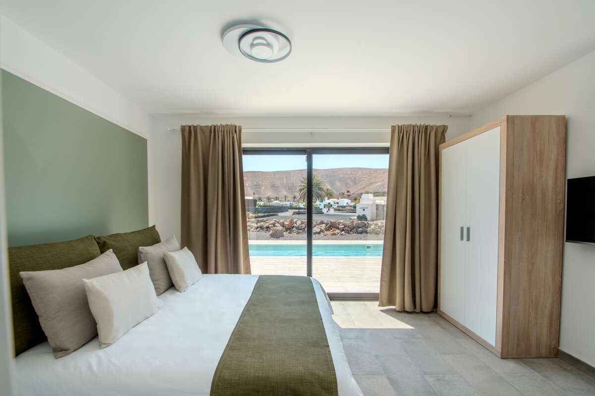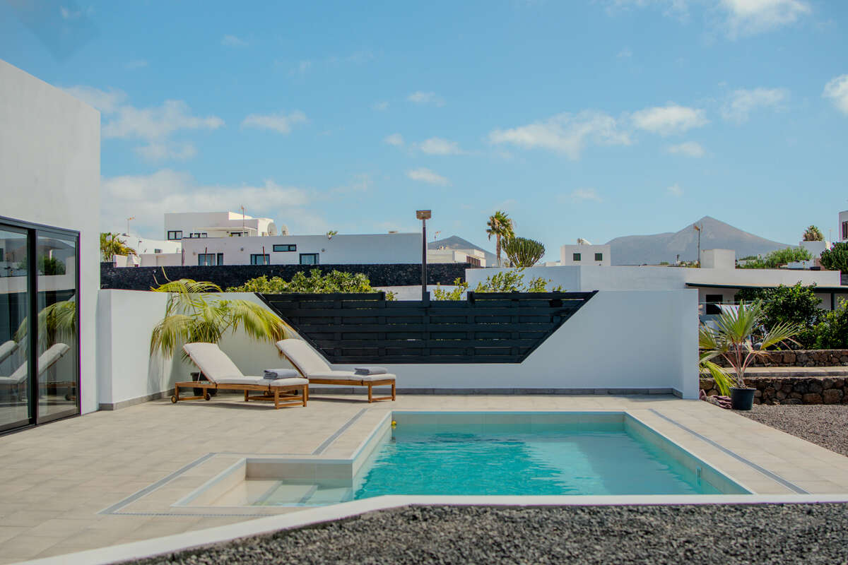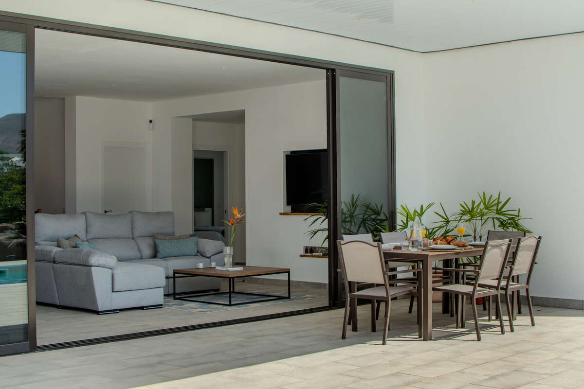 Designed across a single level for effortless flow, the main residence is a masterclass in comfort and brightness. The layout features spacious, inviting living areas, including a sun-drenched open-plan lounge and dining room, a standalone kitchen, and two well-appointed bedrooms accompanied by two full bathrooms. Life here transitions seamlessly from indoors to out; a series of porches, courtyards, and covered terraces invite you to enjoy the Canary Islands' eternal spring all year round. The crown jewel is the private solarium—a privileged vantage point offering breathtaking, panoramic views of the Timanfaya volcanoes, Montaña de la Cinta, and the deep blue of the Atlantic.
