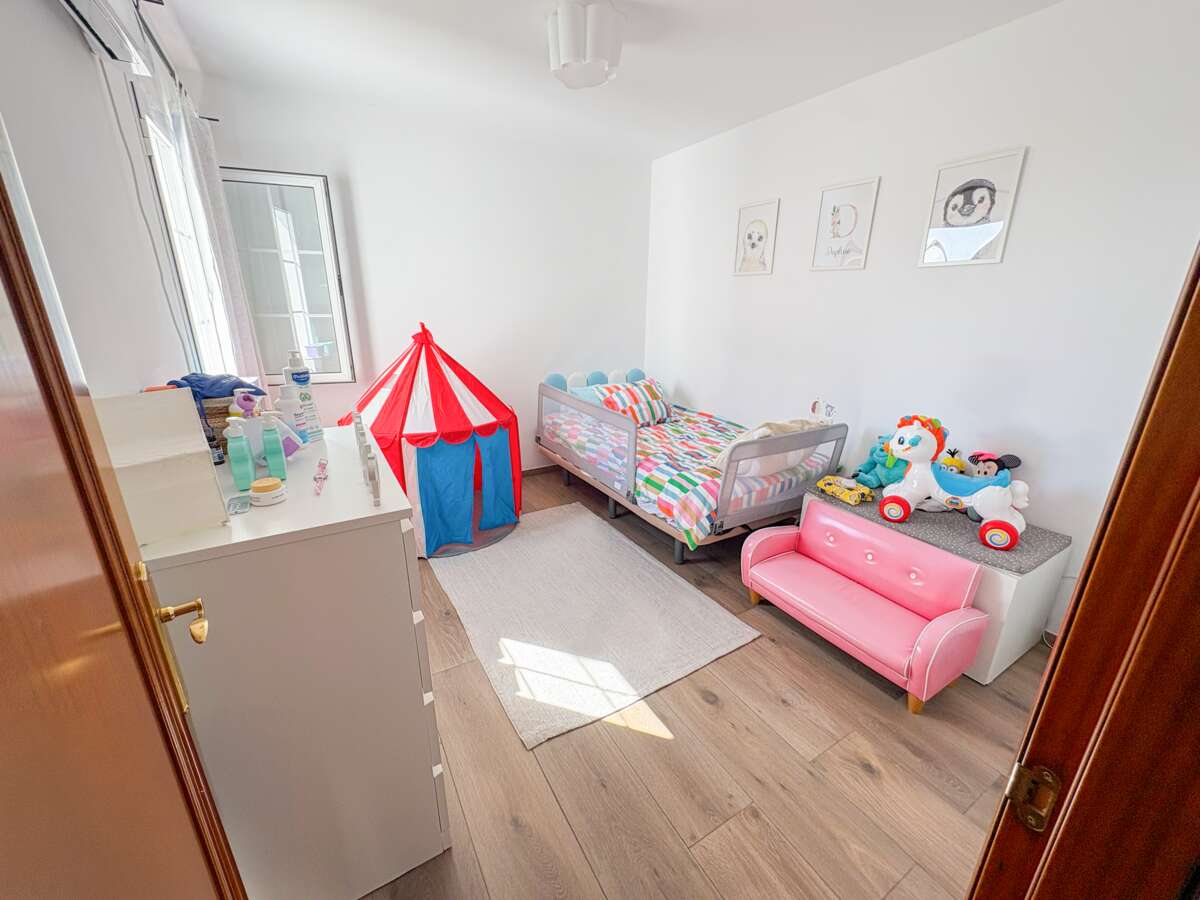 The upper floor is dedicated to rest, featuring three bedrooms: two single rooms with built-in wardrobes, and a master bedroom that stands out with a private dressing room and access to a balcony that brings in natural light. This floor also has a full bathroom with a bathtub, designed for daily comfort.